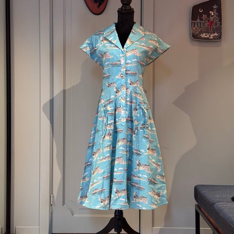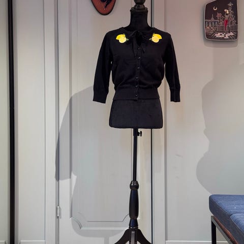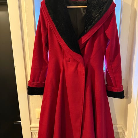 Hell Bunny kåpe i størrelse S, svart farge. Kåpen er vintage inspirert, med et klassisk A-line snitt og knapper foran. Polyester og viskose