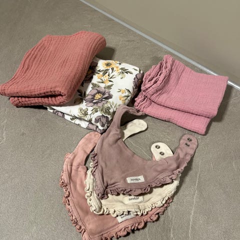 Tre stk. babytepper i 100% bomull. Et dynetrekk. Tre musselinkluter. Alt er svært pent brukt.