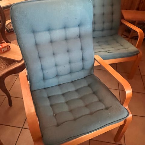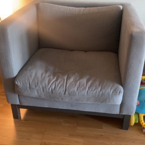 Godt brukt lenestol i lyst, beige, ganske pent stoff. Stolen er slitt og trenger en kjærlig hånd, kanskje du kan trekke den om?