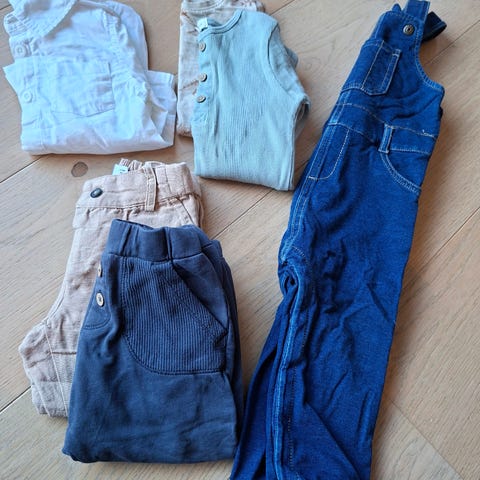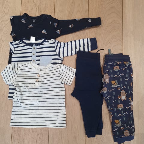 Diverse klær. Noe er mer slitt enn annet. Pysj med sommerfugler er i strl. 74, men stor i strl.