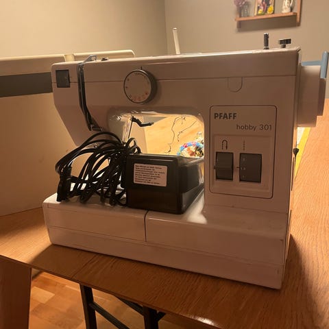 Pfaff symaskin med tilbehør. Maskinen har et klassisk design med hvit og brun farge. Egnet for ulike syprosjekter og materialer.