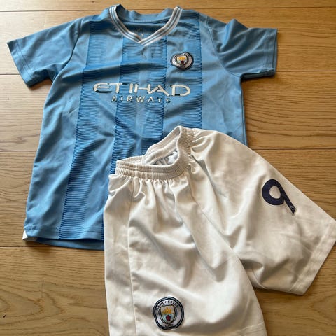 Manchester City fotballtrøye for barn i størrelse 128. Trøyen har et mønster i svart med blå og hvite detaljer, og er laget for fotballbruk. Modellen har nummer 17 og navnet De Bruyne på ryggen.