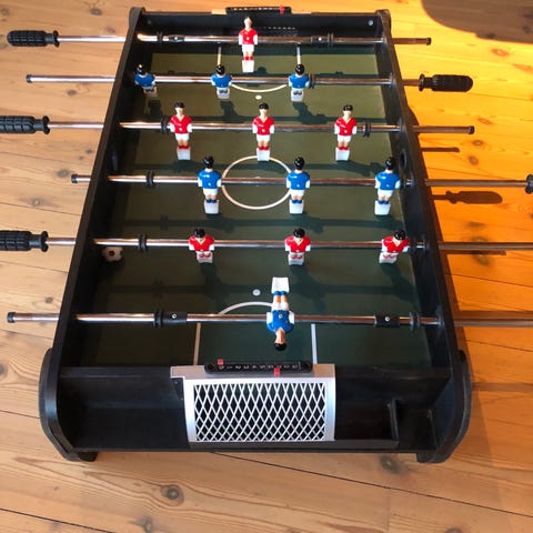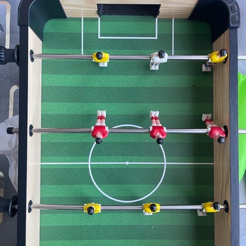 Bordfotballspill med spillere festet på stenger og en fotball. Spillet har en grønn spilleflate med hvite markeringer som etterligner en fotballbane. Passer til innendørs bruk for underholdning og trening av fingerferdighet.