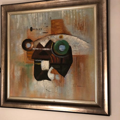 Abstrakt maleri med tekstur og farger i varme toner som oransje, rød, brun og beige. Maleriet har et firkantet format og viser geometriske former og mønstre med innslag av tredimensjonale elementer.