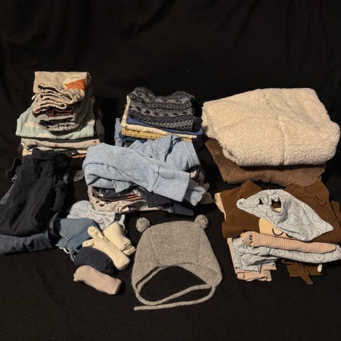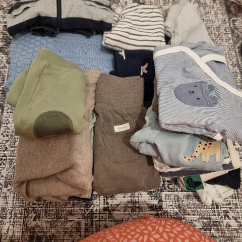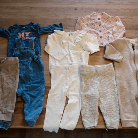 Selger pent brukte babyklær. Det meste er i 68, bortsett fra det grå settet som er i 56 og en body som er i 62. Fås med ammeinnlegg og noen ubrukte (kun vasket) gulpekluter.