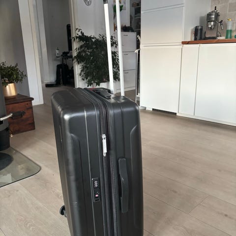American Tourister koffert laget av plastmateriale, designet for unisex bruk. Har et ødelagt hjul men funker ellers som den skal. Hjulet gjør at den er vanskelig å trille