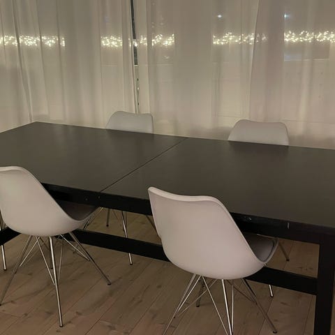 Bordet er i veldig bra stand. Det er 200x90cm. Stolene er nok så slitt og den ene stolen har en skade som vist på bildet. Med sytråd og litt rens kan de kanskje bli ganske bra 👍 Men bordet i seg selv er verdt prisen i mine øyne. Må Hentes i Klæbu.