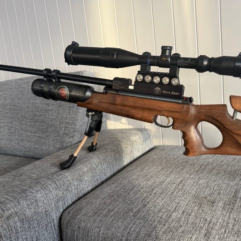 Brukt til bedriftskyting mye våpen igjen. Den trenger en overhaling og ny luftsylinder koster ca 5000,- . Må hentes i askim.