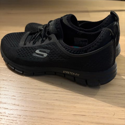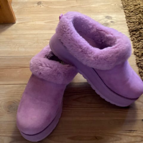 Skechers tøfler og tresko i størrelse 36. Modellen har en brun farge med mykt, lyst fôr rundt kanten. Egnet for innendørs bruk og gir komfort ved lavere temperaturer. Kan også brukes ute.
