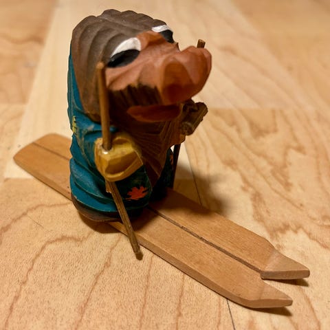 Troll på skitur. Mange detaljer. Ski, staver og ryggsekk med innhold. Høyde ca. 11 cm.