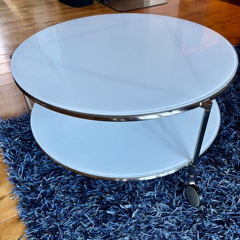 Fint hvitt og rundt salongbord med praktisk skuff med god plass. Diameter 90cm. Obs et lite hakk i bordet som vist på bilde, selges derfor rimelig☺️
