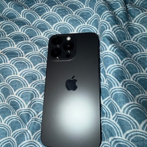 Sort Apple iPhone 15 Pro Max med 256 GB lagringsplass. Telefonen har synlige sprekker i både skjerm og bakside.