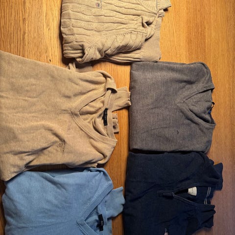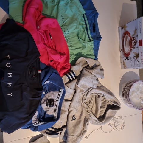 10 gensere (2 collegegensere og 8 hettegensere) selges samlet for kr 800. Noe slitasje har jeg oppdaget, derfor denne prisen. Blant annet et par malingflekker nederst på ermet på den hvite gap-genseren og et lite hull i ermet på grå adidas.