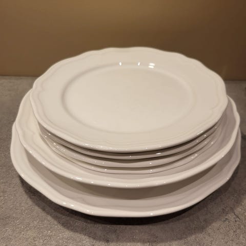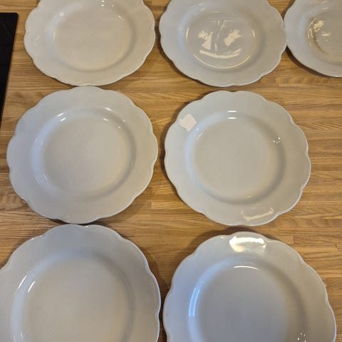 Fire fine hvite asjetter i porselen fra England. Sølv kant med varierende slitasje. 18 cm i diameter. Selges samlet.