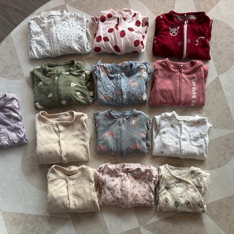 Den grå er i str 62/68 fra Cubus. Den andre er i 62. Den i 62 har et påbegynnende hull, men med et par sting så er den helt fin igjen. Den har vært en favritt 💕 selges samlet.