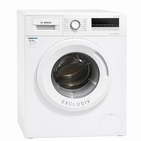 Bosch Frontmatet vaskemaskin med hvit farge. Maskinen har frontlading og er egnet for vanlig klesvask.