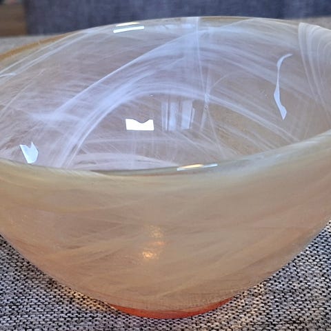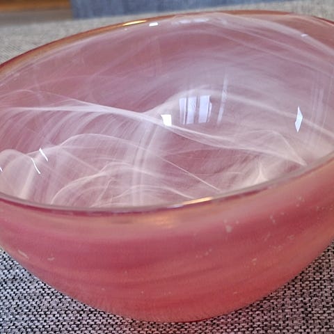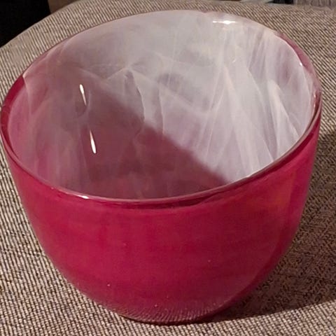 Selger en nydelig håndlaget glassbolle på stett i vakre røde og klare toner. Bollen har et elegant og kunstnerisk uttrykk, og fungerer perfekt som dekor, fruktbolle eller serveringsbolle.