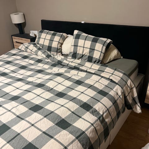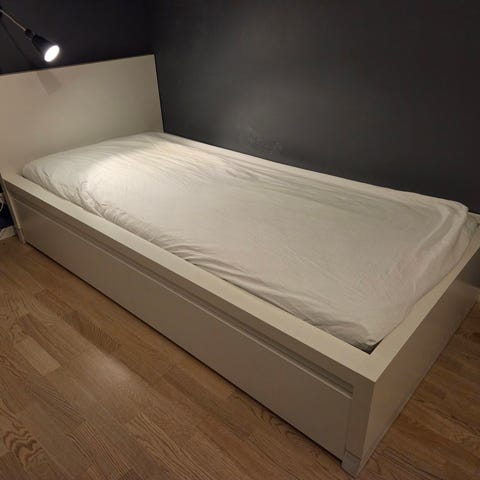 Selger svart MALM seng m/ to oppbevaringsskuffer fra IKEA. I stedenfor sengegalv har vi laget et nattbord i bakkant, se bilde. LURØY ribbebunn.