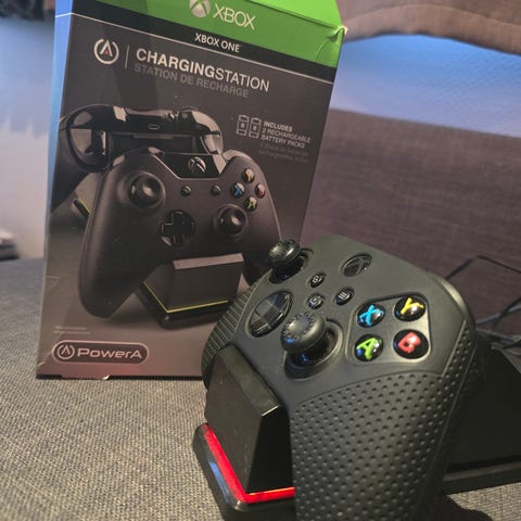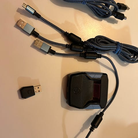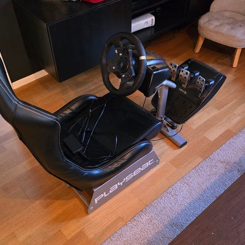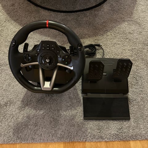 Hori Racing Wheel Overdrive ratt for bruk med Xbox One og Windows. Rattet har flere knapper og en svart farge. Det kobles til via kabel og er designet for racing-spill. Rattet har noe synlige bruksmerker men fungerer som det skal