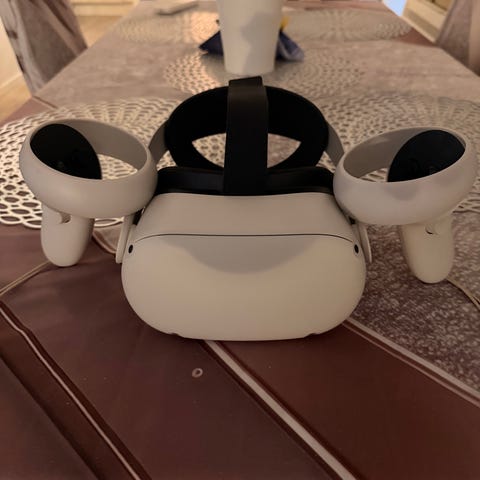 Oculus VR-headset med kontroller. Produktet er et VR-headset med tilhørende kontrollere, egnet for bruk med ulike VR-applikasjoner og spill.