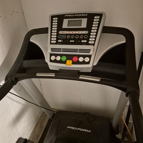 Pro-Form tredemølle i svart farge. Utstyrt med kontrollpanel for justering av hastighet og treningsprogrammer. Passer til innendørs trening og kondisjonsøvelser.