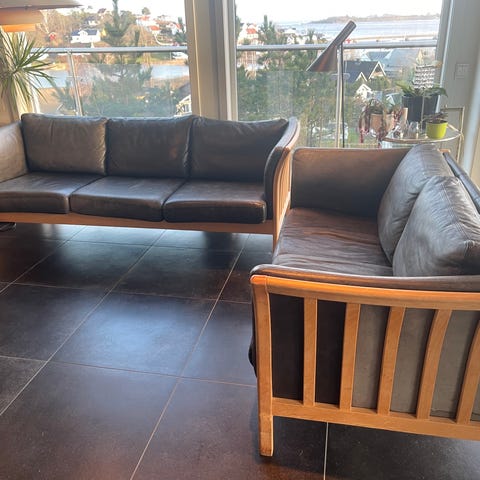 Pent brukt sofa fra IKEA i brunt cognac-farget anilin-skinn- ny pris 19995,- I god stand, men har noen katteklor på venstre vange (se bilde). Må hentes i Tønsberg (1.etg enebolig).