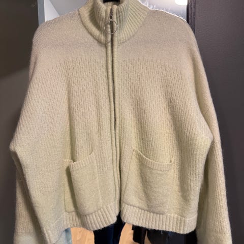 Holzweiler Cardigan i beige, laget av alpakkaull. Størrelse XS, designet for kvinner. Cardiganen har en ribbestrikket tekstur og to frontlommer.