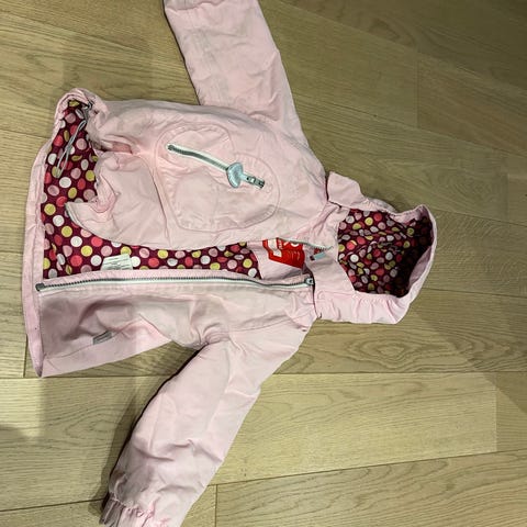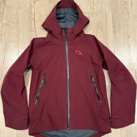 Str 12 år. Orginalpris 1600 kroner. 3 lags jakke. Tåler regn. Flere stramme muligheter - nederst, armene og på hetta. Ventilasjonsmuligheter under armene.