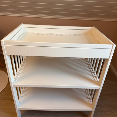 IKEA stellebord, modell Gulliver mest trolig, i hvit farge. Brukt av to barn, nyvasket før salg. Inkluderer madrasspute og to søte trekk - også nyvasket. Møbelet har åpne hyller for oppbevaring av barneutstyr.