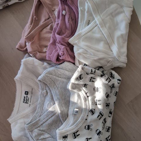 Selges div. klær, hovedsakelig str. 56. Selges samlet for 300,-. Et sett med ull, noen bodyer og bukser, to dresser, noen gensere.