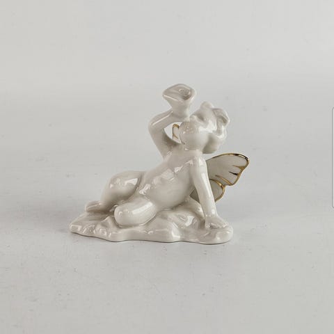 Georg Jensen lysestake laget i gullfarget metall. Lysestaken har en høyde på omtrent 10 cm og en rund, buet form.