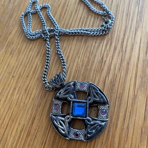 Unikt sølvfarget korsanheng med "diamanter" i ulike grønntoner