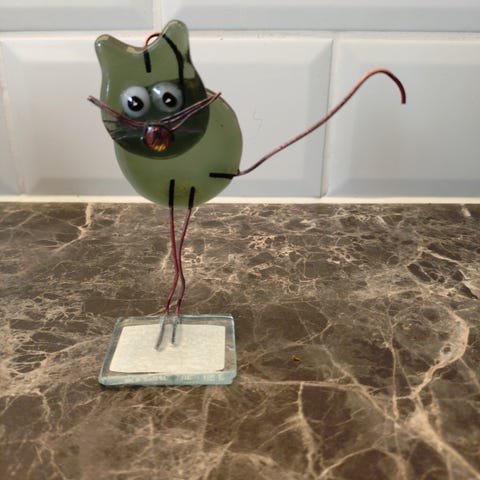 EN KATTEFIGUR I GRØNT OG KLART GLASS.