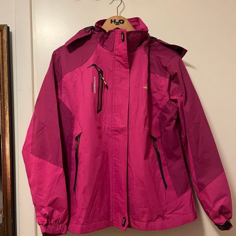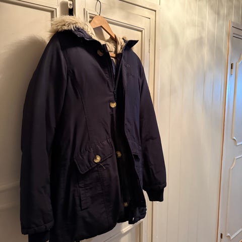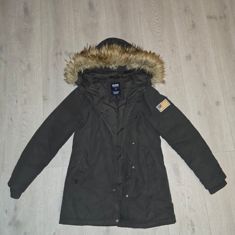 Svea vinterjakke i størrelse M for damer. Jakken er svart og laget av bomull. Den har en hette med pelskant, flere lommer og er designet for å gi varme i kalde værforhold.
