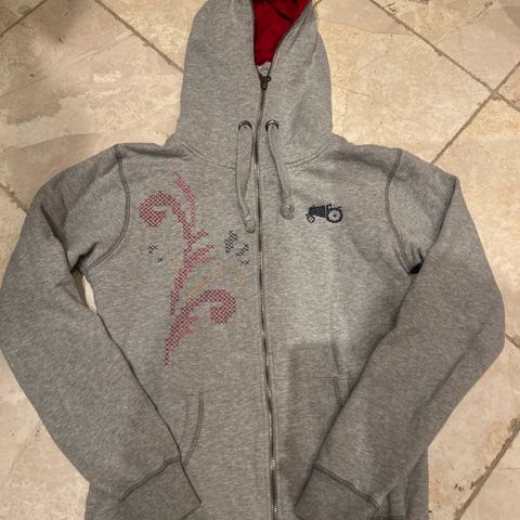 Chill Norway lysgrå og hvit hettegenser / hettejakke str l. Har mistet den som stikker ut for å dra glidelås opp/ned. Men det går helt fint å ta den opp/ned uten.