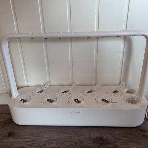 Click & grow smart garden innendørs plantekasse i grå farge. Designet for å dyrke urter og små planter innendørs. Har integrert LED-lys for optimal vekst. Passer for bruk i kjøkken eller andre innendørs områder.