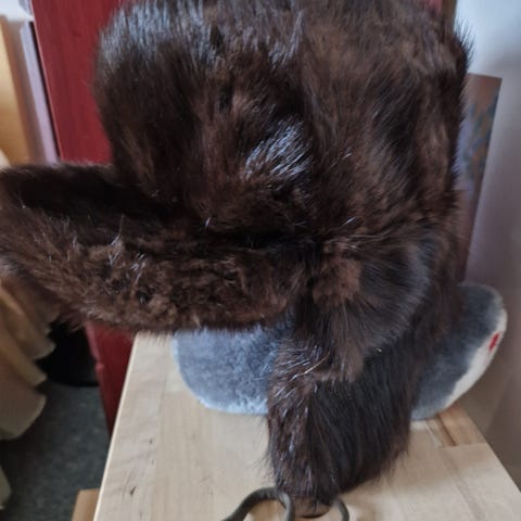 Skinnlue/bjønnfitte med øreklaffer. Bollen jeg tredde den på er 57,5 cm i diameter. Vil tippe luen er str 57. Spor etter merkelappen nedi/inni. Fargen kommer best fram på de to første bildene. Kan sendes mot at kjøper betaler porto på 69.-