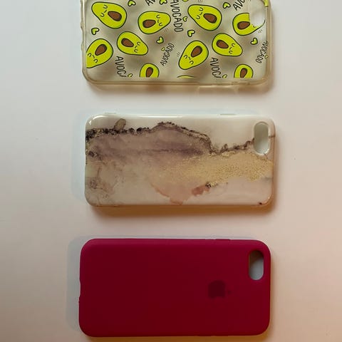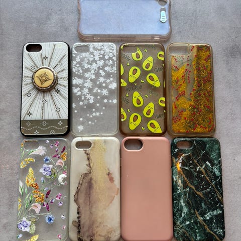 15 stk iphone telefondeksler selges. Dekslene varierer i design og materiale, inkludert myke og harde varianter. Passer til iPhone 7/8 SE.