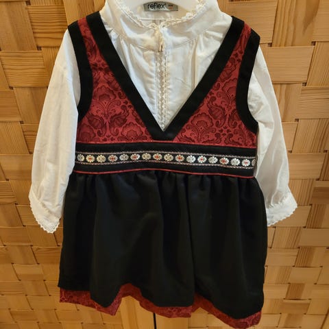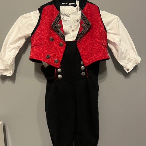 Bunad selges med vest, nikkers, skjorte og sokker. Noe stor i størrelsen.