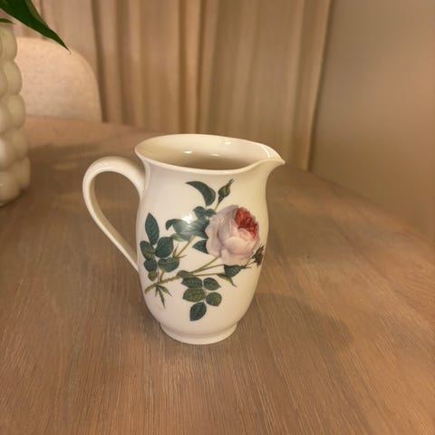 Liten glassert blå kjeramikkmugge til melk, saus mm. 10 cm høy, c7- 9 cm i diameter. Sendes mot betaling.