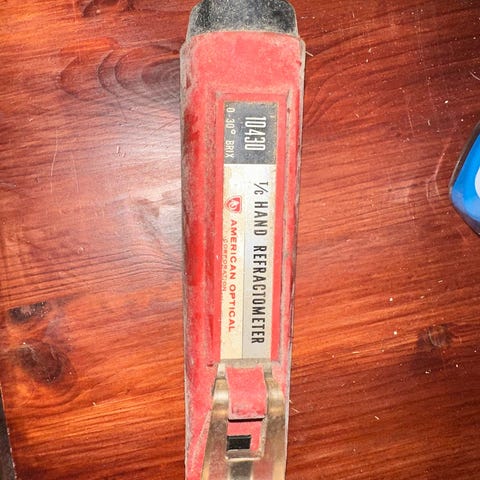 Refraktometer i boks med etui. Brukes til å måle brytningsindeks i bl.a. spylevæske. Leveres med rengjøringsklut og oppbevaringsboks.