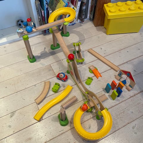Fin og morsom kulebane med alle deler selges. Lekt med av sønnen vår, men ligget ubrukt hen de siste årene. Normal slitasje, men ingen store hakk eller riper.