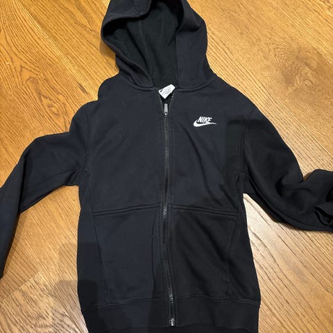Nike hettegenser i størrelse 152 for gutt, laget av bomull. Genseren er hvit med rødt Nike-logo og har hette og kengurulomme. Materialet gir komfort og egner seg til hverdagsbruk. For 11-12 åringer