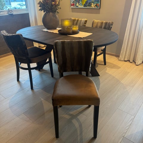 Spisegruppe. Bordet kan forkortes ved behov. Følger med seks stoler.