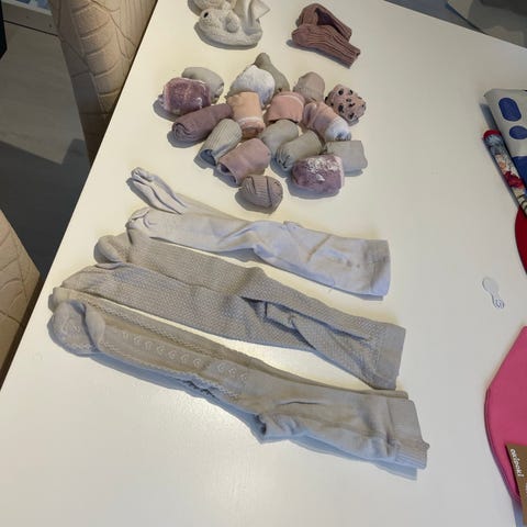 Fleste er heilt tynne. Mange einsfarga, kvite og rosa med russje kant på.