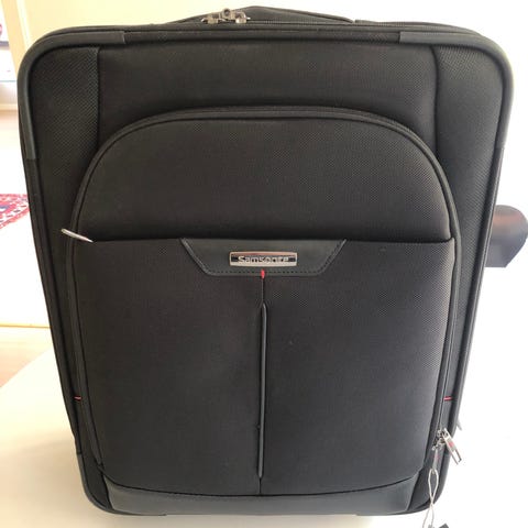 Samsonite Spinner kabinkoffert 55/20, laget av 100% resirkulert plast. Den har integrert 3-punkts TSA-låsesystem, fire doble hjul , håndtak og hjul for enkel transport. Innvendig rom med oppbevaringslommer og stropp for å sikre innholdet. Egnet for reise og oppbevaring av klær og personlige eiendeler. Pen brukt. Ingen feiler eller mangler.