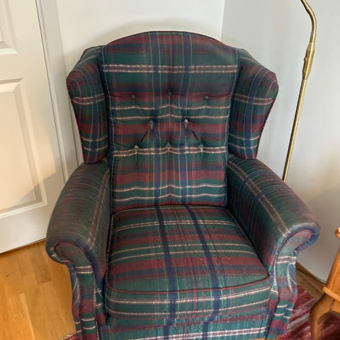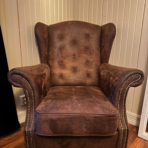 Brun og beige skinnstol , svært behagelig. Flekkene skyldes bruk av lær-rens som skadet fargen på skinnet. Ellers fungerer den som den skal. Merket Stressless.
