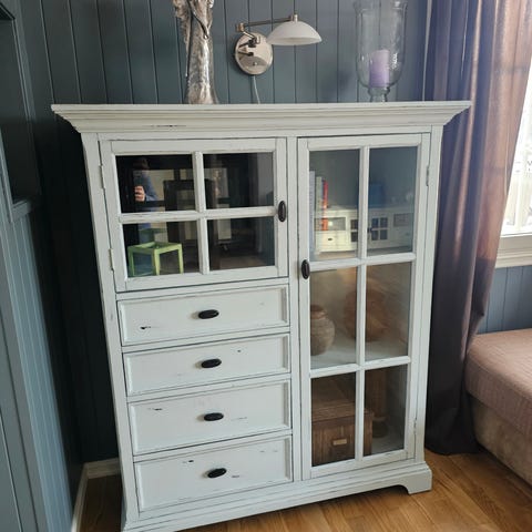 Det var hvitt, men vi har malt det i en beige farge, og blå inni. Løst ben under (et 5. ben), som ikke vises - og uten betydning når en kan bare plassere den under skapet.