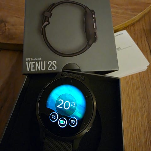 Garmin Venu 2S smartklokke med lys grønn reim. Klokken har en rund urskive og er designet for å gi helse- og aktivitetsmålinger. Passer for daglig bruk og trening.