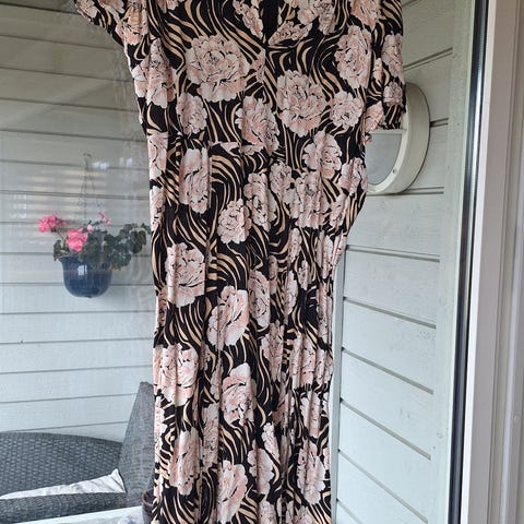 byTiMo kjole i størrelse L . Kjolen har svart farge med mønster og er laget av viskose. Glidelåslukning i ryggen. Egnet til både hverdag og litt finere. Like flott til høye støvletter som til småsko.